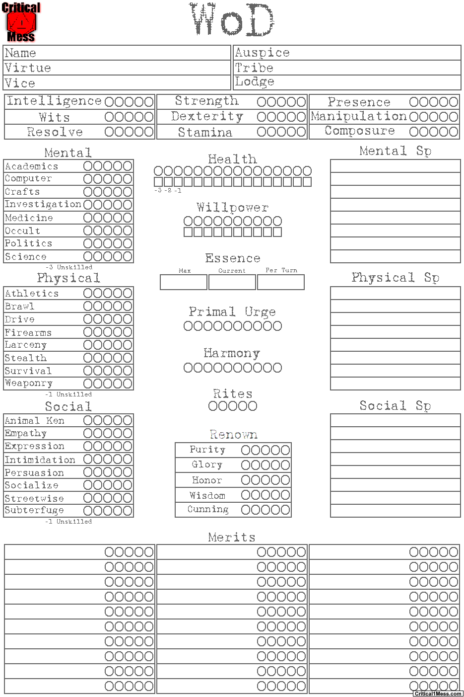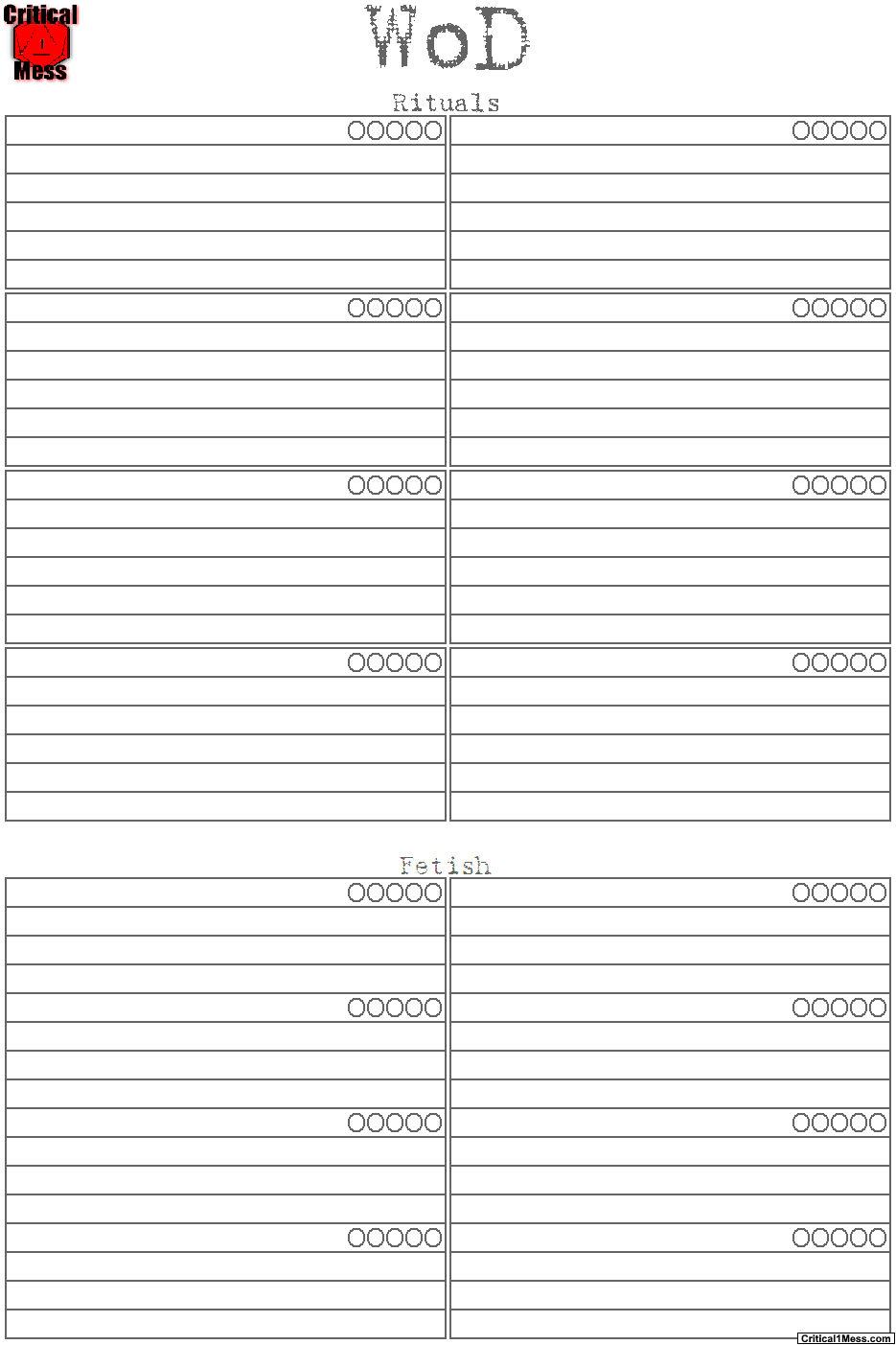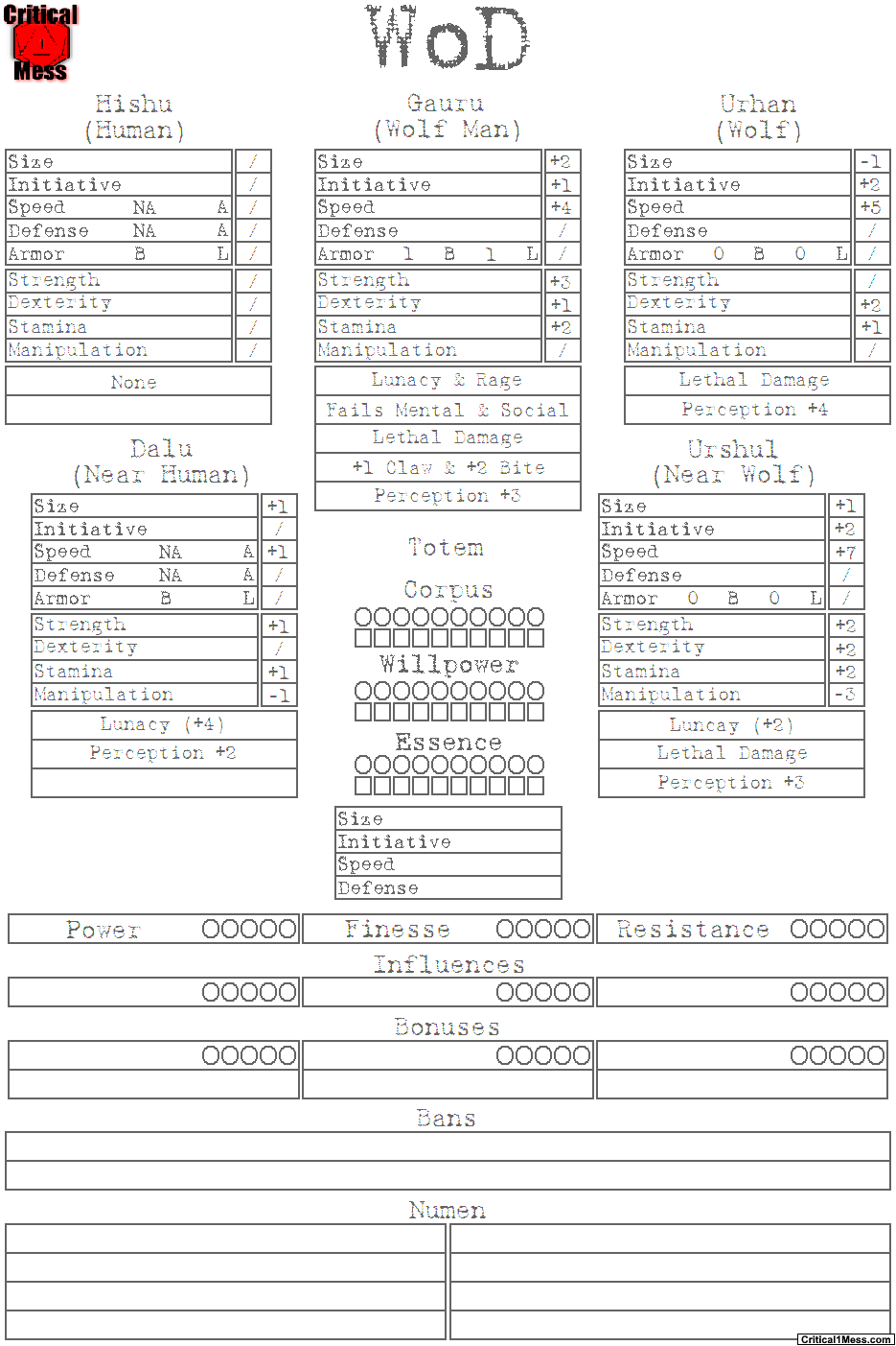 These Werewolf: The Forsaken character sheets are meant to be used in unison with my NWoD Custom Human Character Sheets. This is done by Replacing the first page and adding the last three pages to the rest of those sheets.