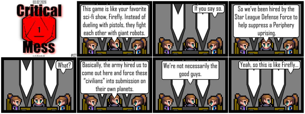 BattleTech is fun like that. There really are no “Good Guys”. Just a bunch of fucked up humans doing fucked up stuff. My sister has also eagerly informed me that Firefly may finally be seeing a revival.